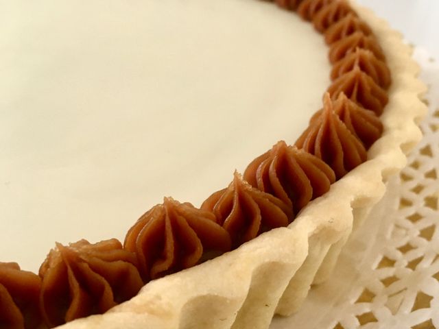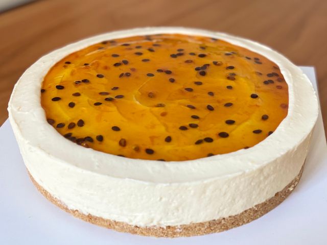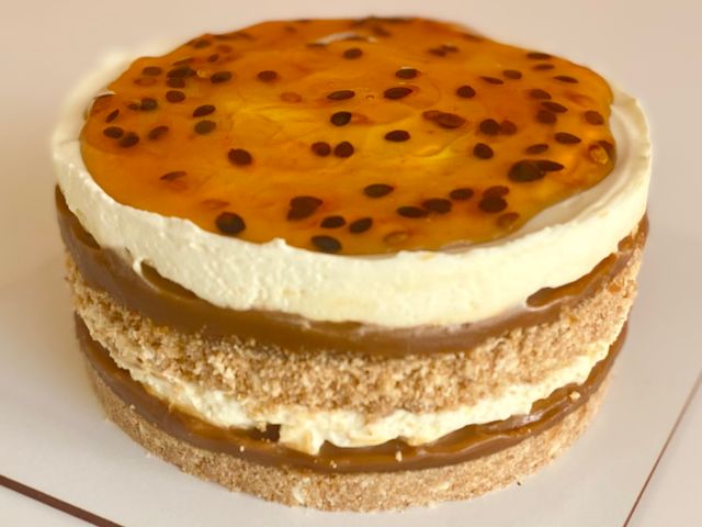 Doble capa de crocante de cookies y chocolate blanco, dulce de leche, crema y salsa de Maracuya
