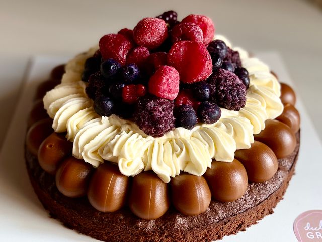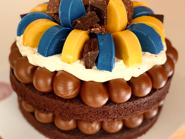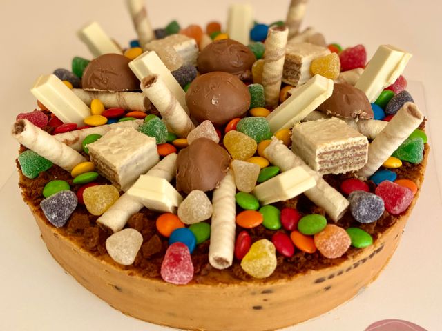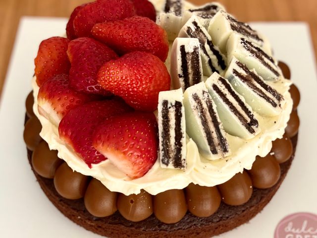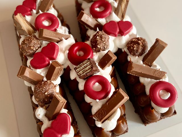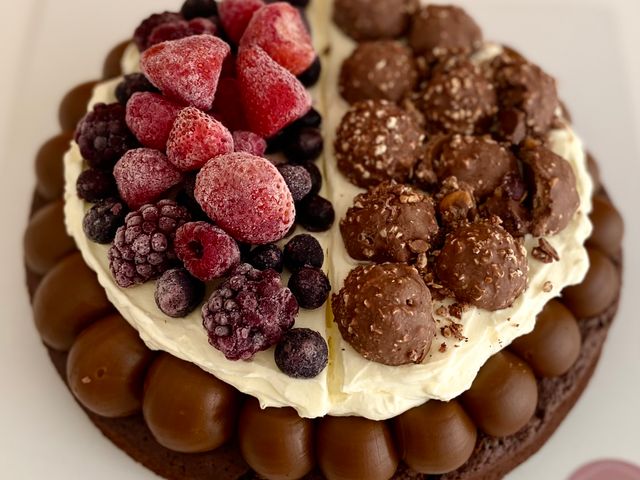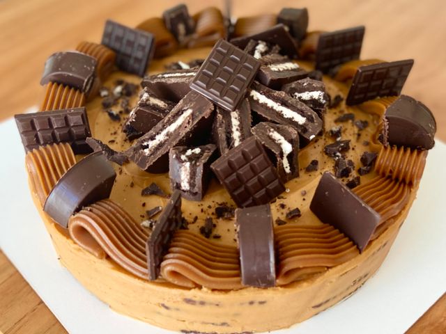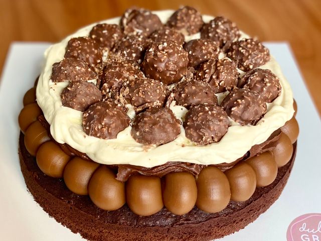 Doble capa de brownie y dulce de leche + crema + oreos bañadas en chocolate (color a elección) + Ferrero Rocher + trozos de chocolate Águila