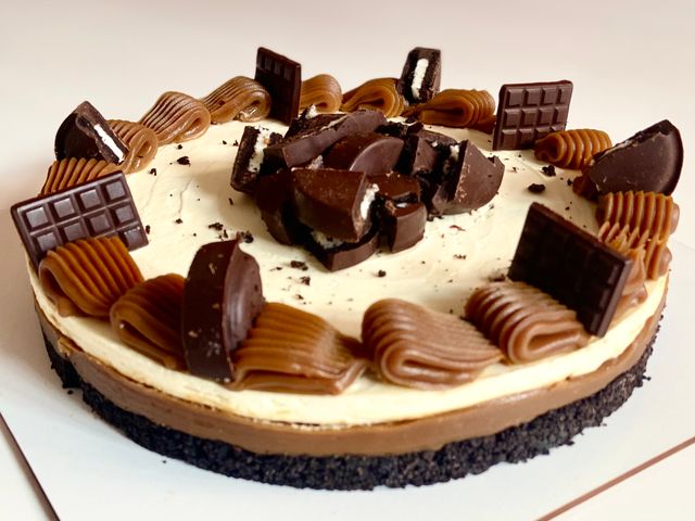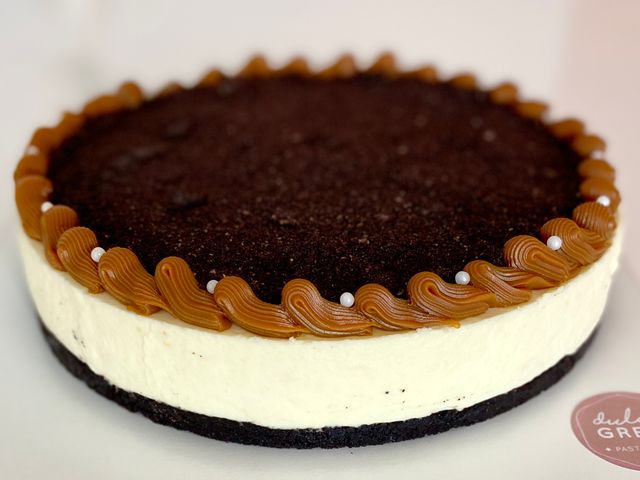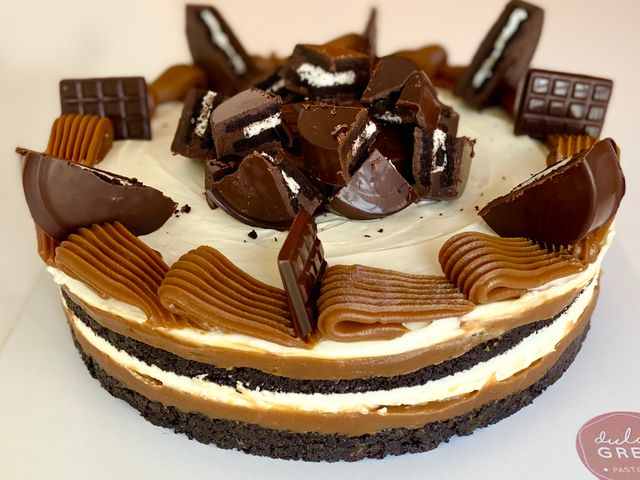Doble capa de oreo, doble capa de dulce de leche y doble capa de crema. Decorado con oreos bañadas